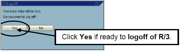 Note: The message that unsaved data will be lost is a reminder to ensure transactions like requisitions or journal entries have been saved before exiting R/3. This message doesn’t apply to financial reports and display transactions. If unsure, click on the No button, review the screen, and save data.