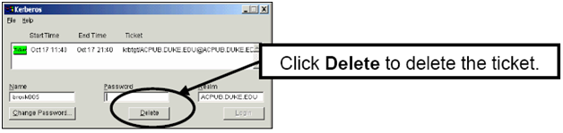 3. IMPORTANT: Open/maximize the Kerberos (Authentic Login) dialog box; click on the Delete button to delete the green ticket.