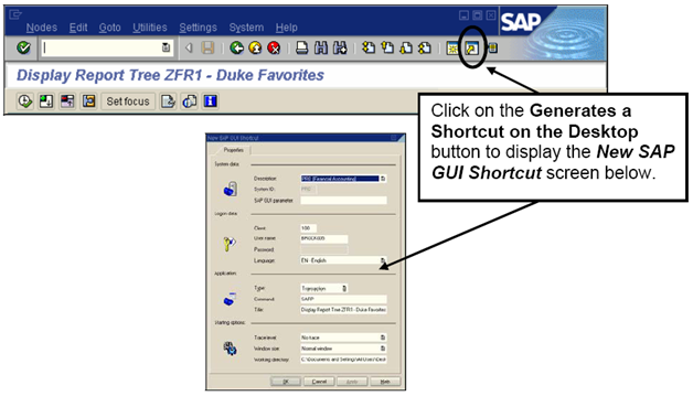 2. Click on the Generates a Shortcut on the Desktop button to display the New SAP GUI Shortcut screen (see below).