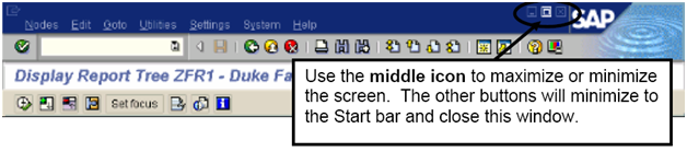 The “maximize / minimize” button is located in the middle of three Windows buttons in the upper right corner of any R/3 screen. The buttons have a duller highlight until the cursor is paused on each button. Each time the middle button is clicked, the screen toggles between being maximized or minimized. Maximizing each R/3 screen (window) is recommended to allow better viewing and access of the R/3 buttons.